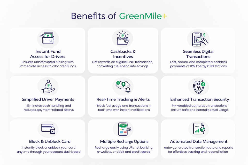 In a fast-moving world, fleets need more than fuel — they need control, clarity, and confidence. GreenMile+ Card by IRM Energy is designed to power fleets with seamless CNG fuelling, digital convenience, sustainable performance, and endless rewards.
